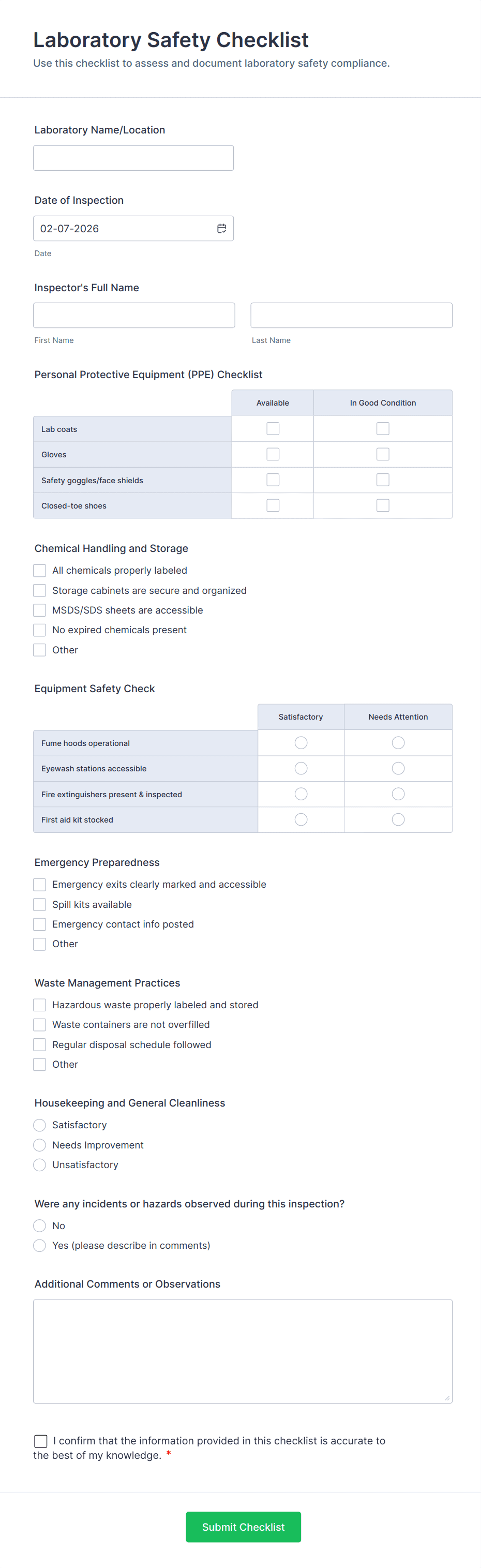 An environmental inspection checklist is a survey to assess the environmental and safety standards of a building or a facility.