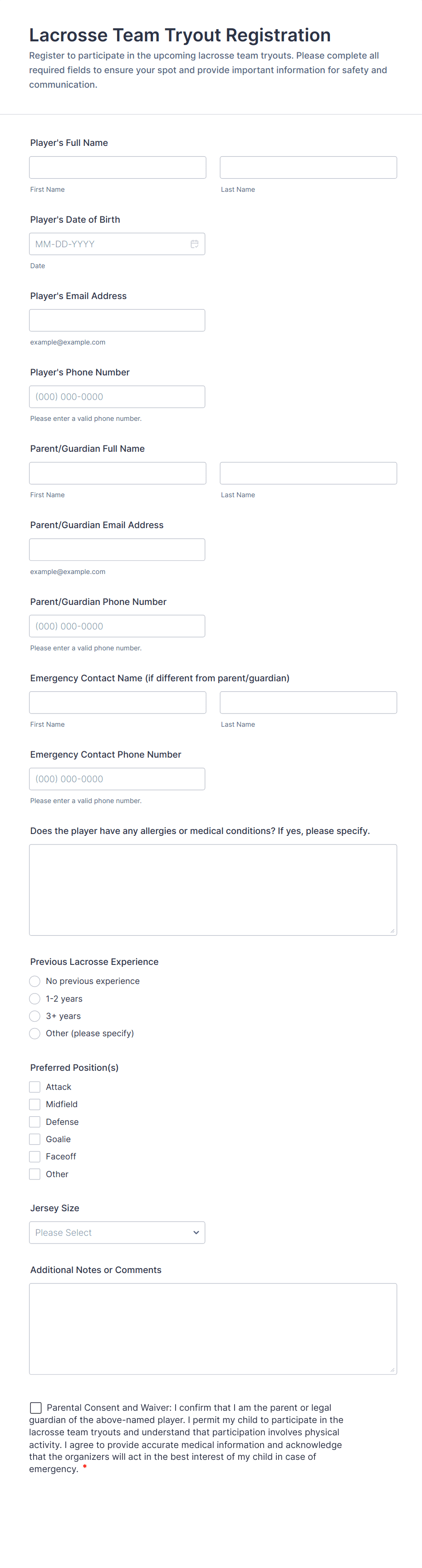 A player tryout registration form is used by sports teams to register interested players for a tryout.