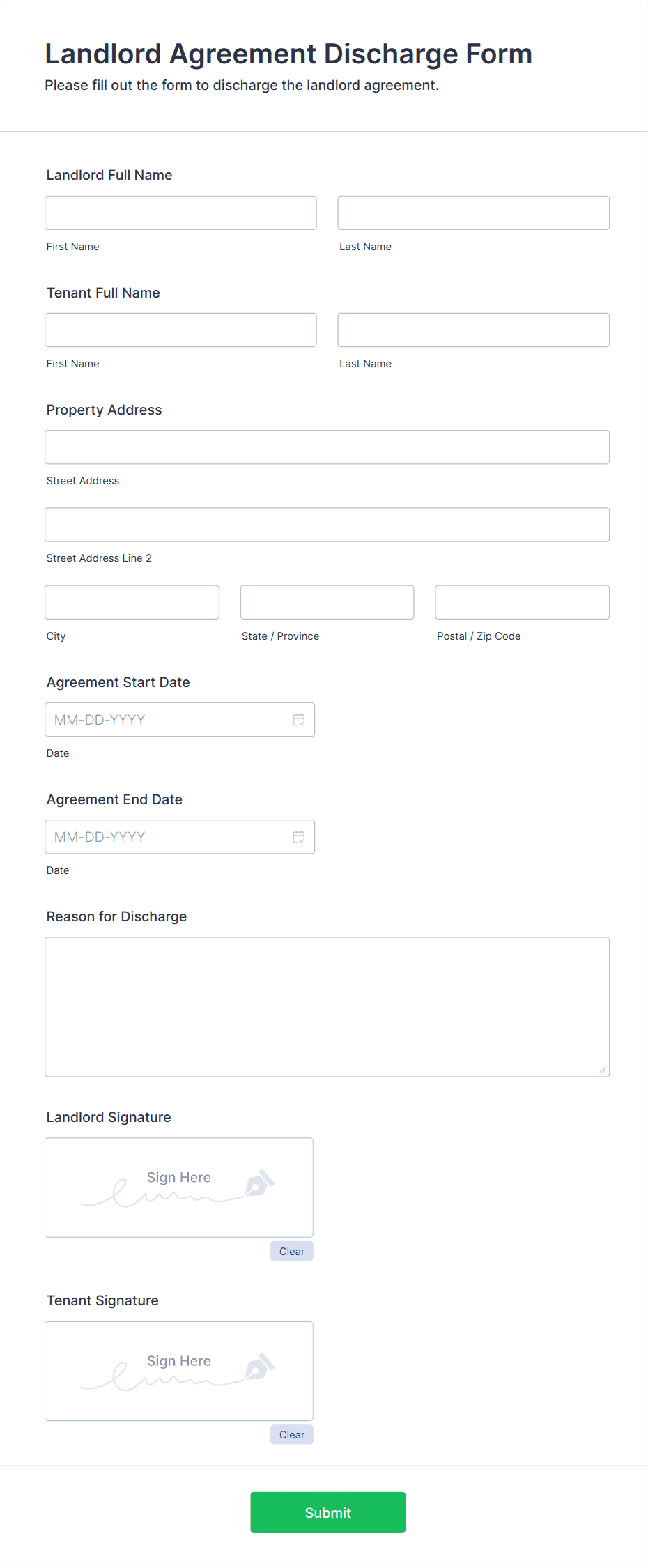 The form templates here are for informational purposes only. Jotform is not providing legal, financial, or other advice, or implying that the forms are legally valid in all or any jurisdictions. Before using any such form, consult an attorney and/or other applicable professionals to make sure that the form meets your needs, legally and otherwise.