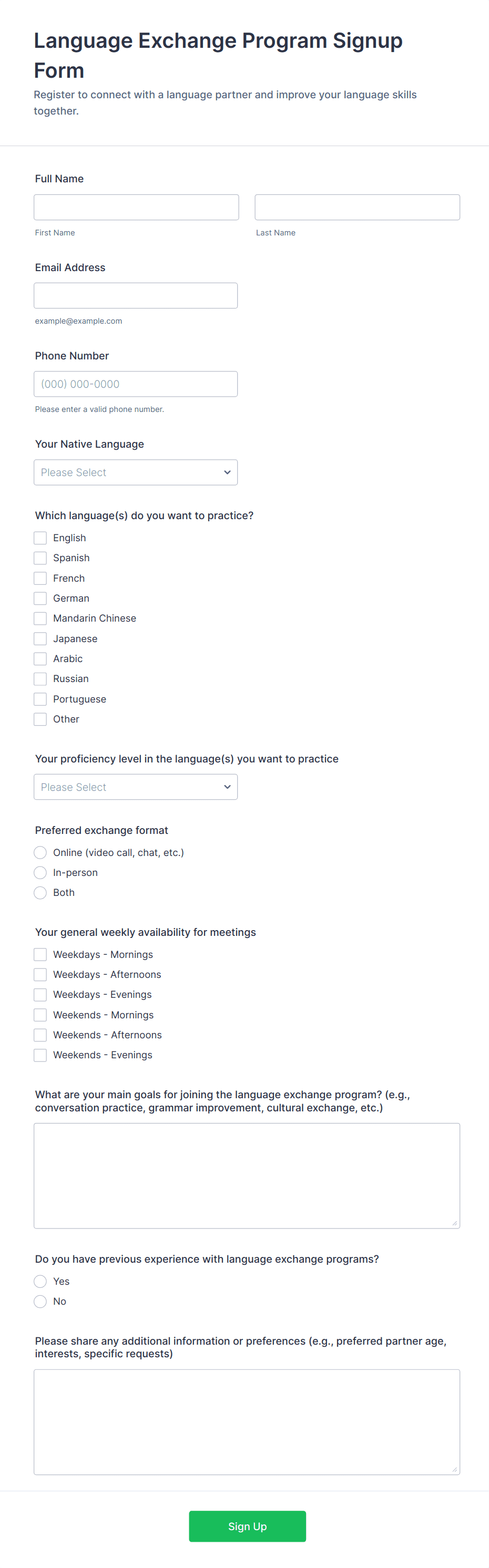 Sign up forms are essential digital tools used to collect information from individuals who wish to join, subscribe, or participate in a service, event, or platform. Whether you’re managing event registrations, building an email subscriber list, onboarding new members, or recruiting volunteers, sign up forms streamline the process of gathering key details such as names, contact information, preferences, and consent. Their versatility makes them invaluable for businesses, educational institutions, nonprofits, clubs, and community organizations looking to efficiently manage participation and engagement.