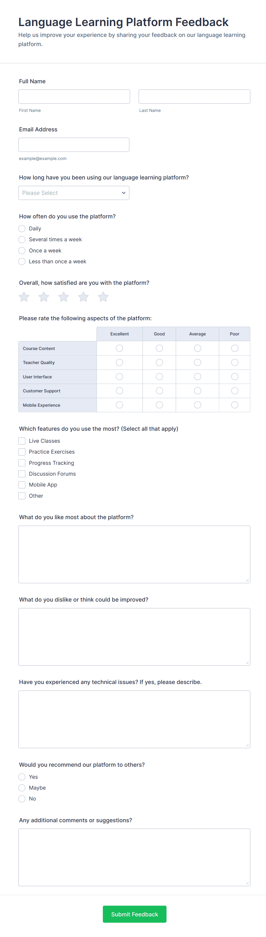 • Product feedback forms may include questions about usability, features, and likelihood to recommend.