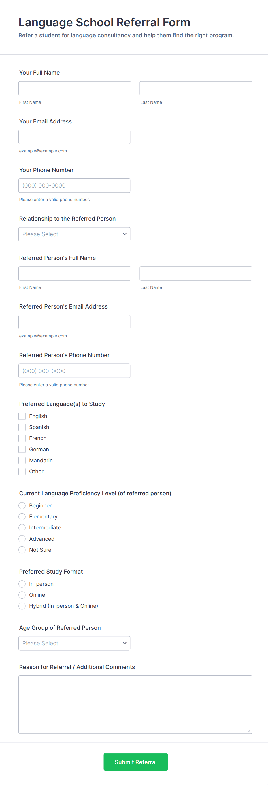 • For healthcare or sensitive referrals, include fields for privacy agreements or HIPAA compliance.