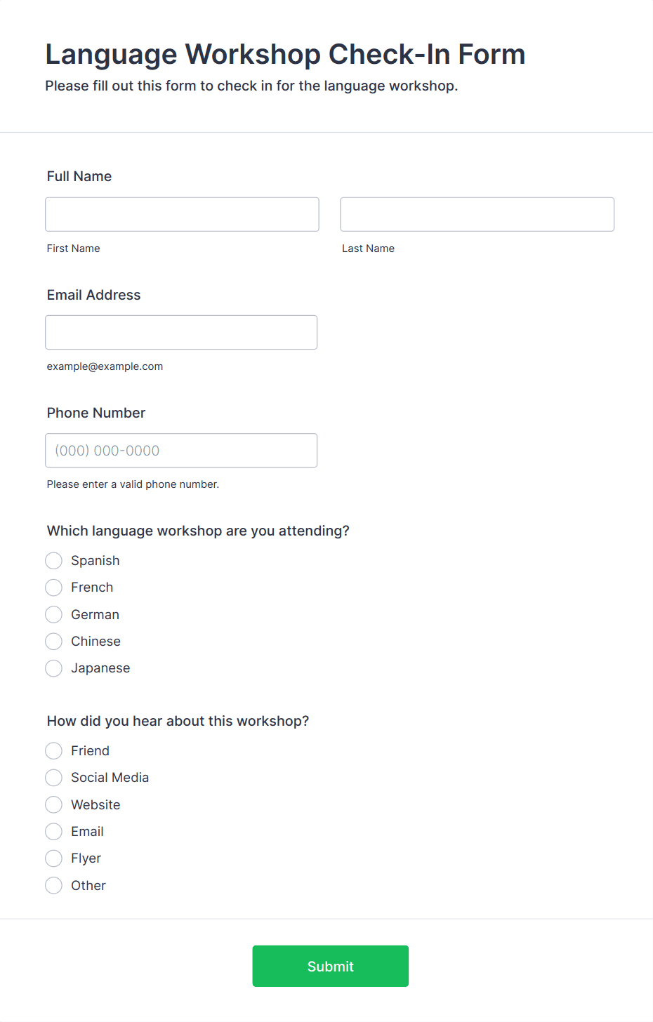 3. What information should be included in a workshop registration form?