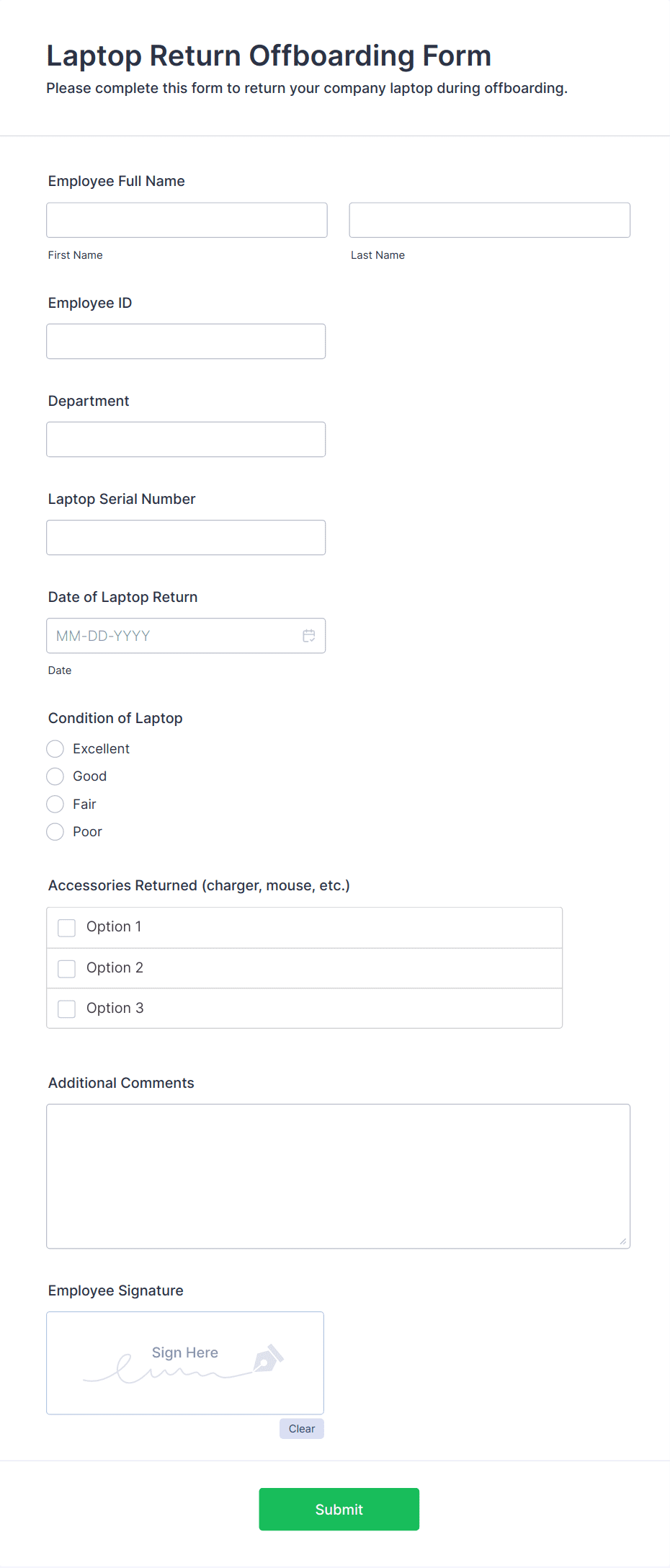 The form templates here are for informational purposes only. Jotform is not providing legal, financial, or other advice, or implying that the forms are legally valid in all or any jurisdictions. Before using any such form, consult an attorney and/or other applicable professionals to make sure that the form meets your needs, legally and otherwise.