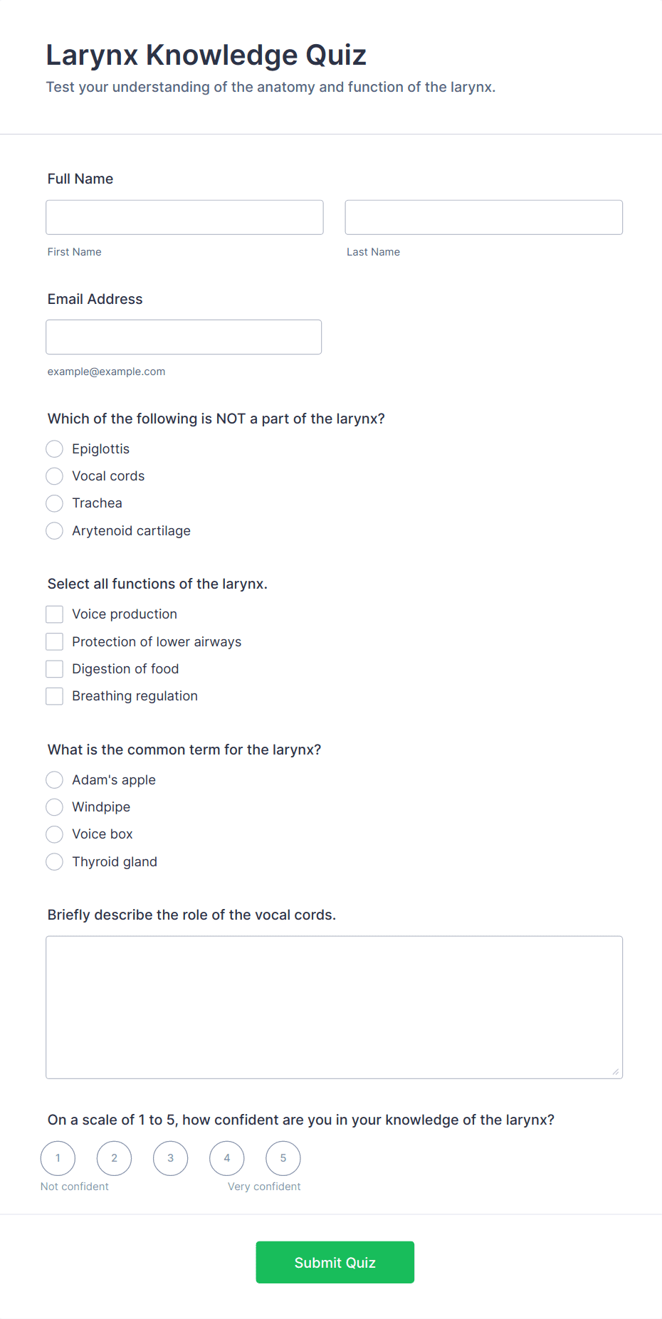 Quiz Templates are pre-designed forms specifically created to facilitate the process of building quizzes for a variety of purposes, such as education, employee training, lead generation, event engagement, and more. These templates provide a structured way to present questions, collect answers, and automatically score or evaluate responses. Whether you’re a teacher assessing student knowledge, a business running a product knowledge test, or a marketer creating a fun personality quiz, Quiz Templates offer a flexible foundation to suit your needs. They can be used for online exams, trivia games, onboarding assessments, customer feedback quizzes, and interactive learning modules.