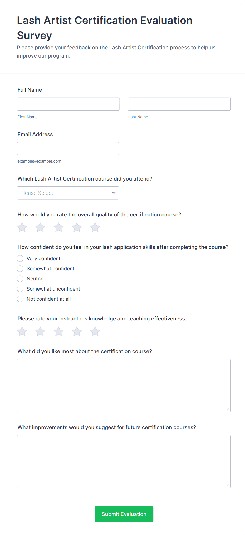 Evaluation surveys are structured tools designed to gather feedback, measure satisfaction, and assess the effectiveness of programs, services, events, or products. They are widely used across various industries and sectors, including education, healthcare, business, and nonprofit organizations, to collect valuable insights from participants, clients, employees, or stakeholders. Common use cases include course evaluations, employee performance reviews, event feedback, customer satisfaction assessments, and program impact studies. By systematically collecting and analyzing responses, organizations can identify strengths, uncover areas for improvement, and make informed decisions to enhance their offerings.