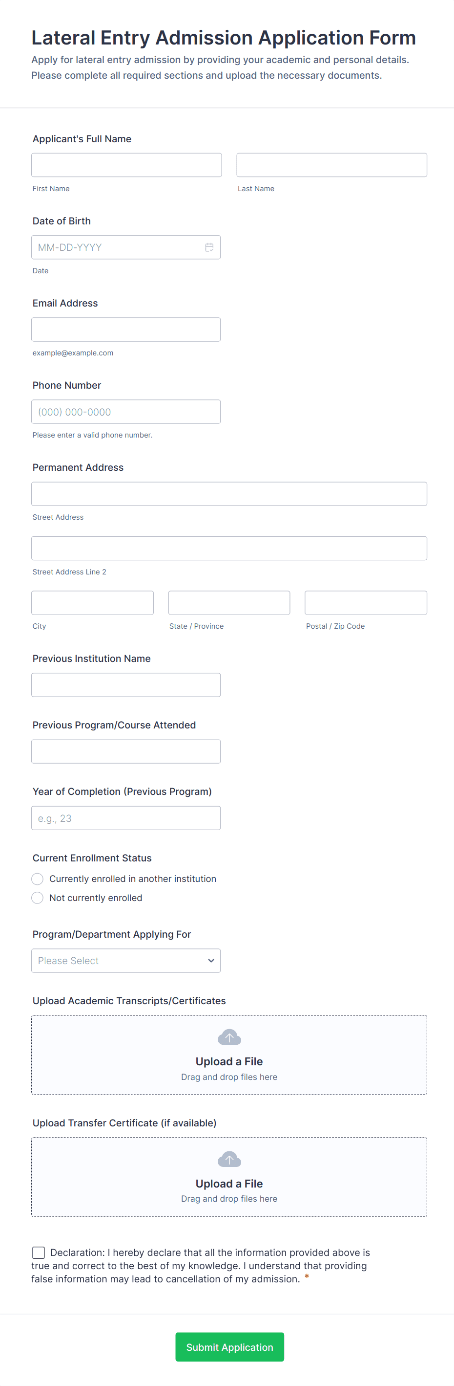 • Student Admissions: Forms may require fields for academic records, previous schools, guardian information, and document uploads.