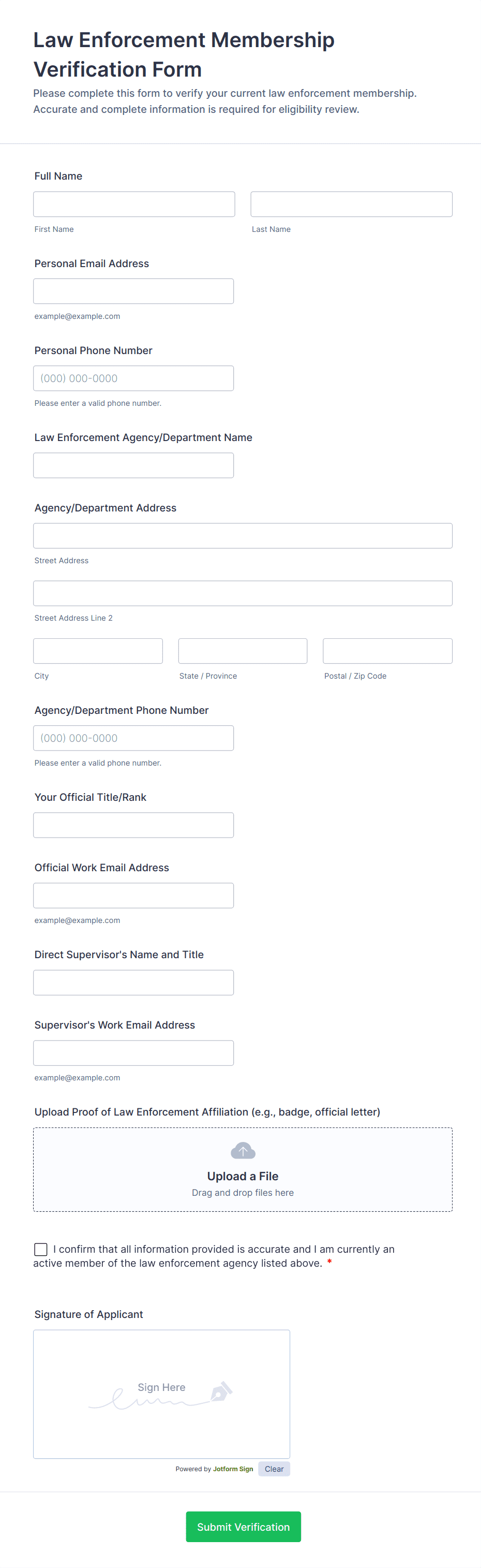 Verification forms are specialized digital tools designed to authenticate, validate, or confirm information provided by individuals or organizations. These forms are commonly used to verify identities, credentials, employment status, addresses, or other critical data points in a secure and efficient manner. Typical use cases include onboarding new employees, confirming student enrollment, validating customer identities for financial services, or ensuring the accuracy of submitted documents in compliance processes. By streamlining the verification process, these forms help organizations reduce fraud, maintain regulatory compliance, and build trust with their stakeholders.