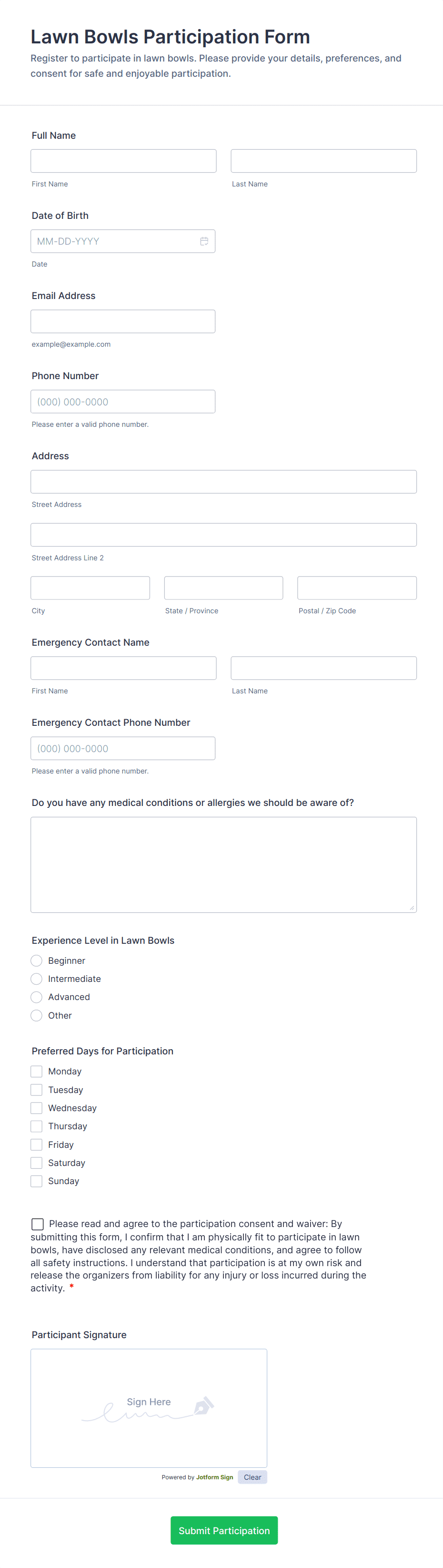 By following these steps, you can create a comprehensive Sports Registration Form that streamlines sign-ups, ensures compliance, and keeps your event organized. Jotform’s no-code builder and robust features make it easy to adapt your form for any sport, age group, or event type, solving common challenges like data collection, payment processing, and communication.