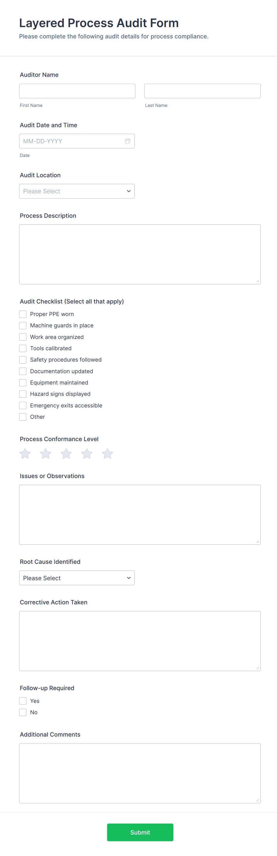 - Customize fields based on your audit type (e.g., safety, quality, compliance).