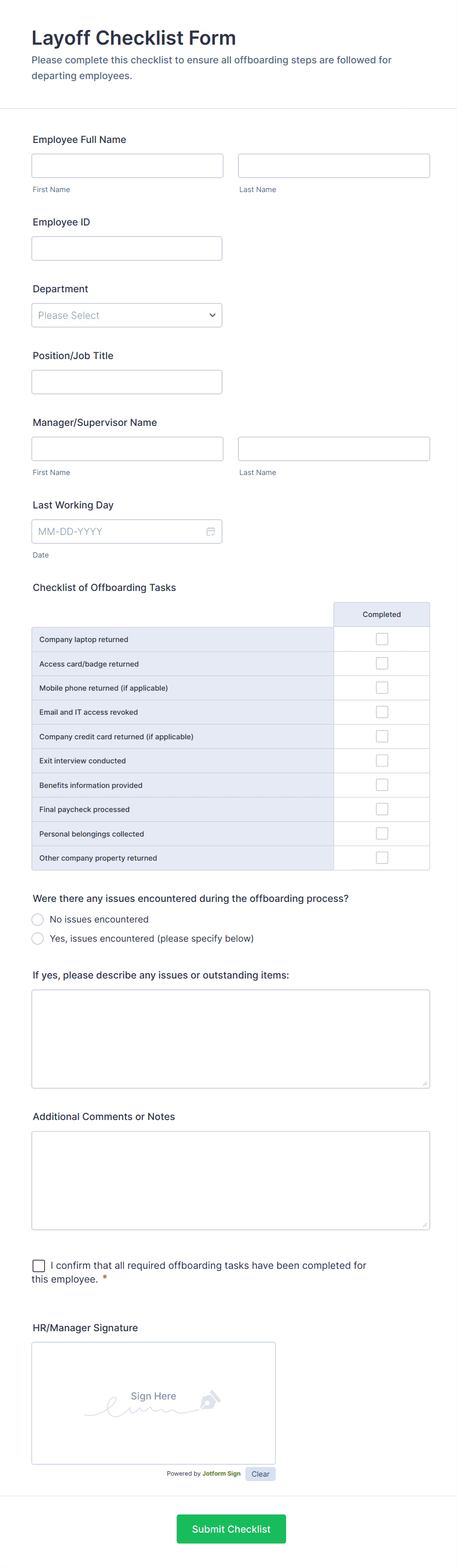 HR departments can use this free Exit Interview Form to conduct exit interviews online. Customize the form and share via email to quickly collect employee feedback.