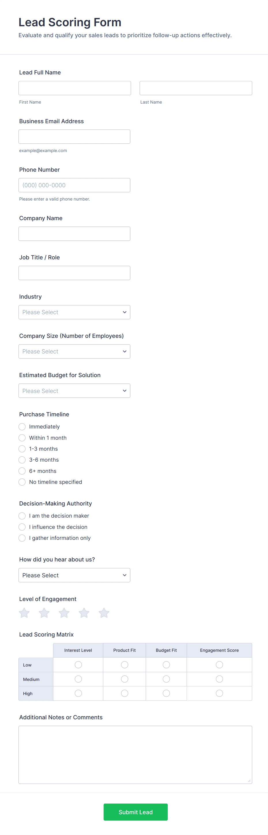 - For more advanced lead qualification, include dropdowns, multiple choice questions, or short/long text fields for specific needs (e.g., budget, project details, industry).