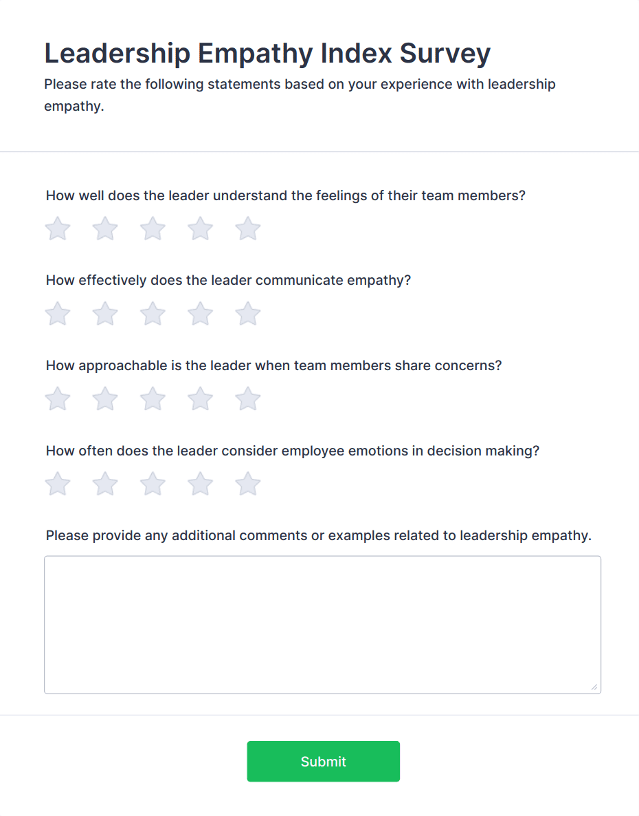 • For engagement surveys, include questions about job satisfaction, leadership, and work environment.