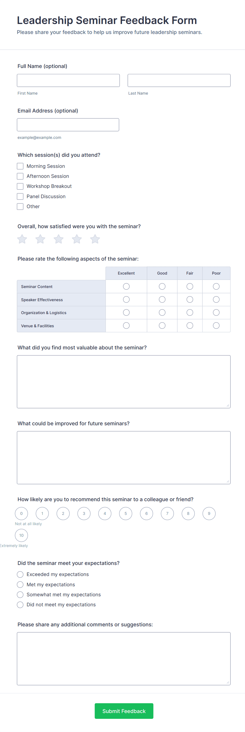 Use rating scales for clarity, usefulness, pacing, and satisfaction. Add short text fields for what worked well and what should improve.