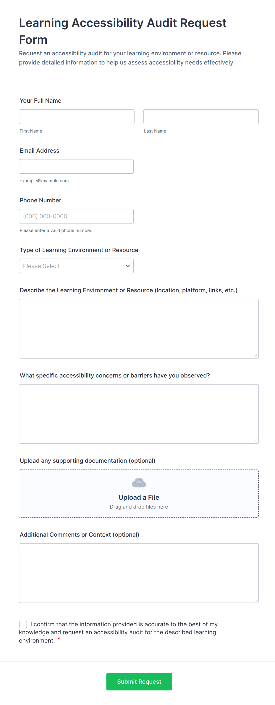• Compliance Audits: Require fields for regulatory references, evidence collection, and sign-off sections.