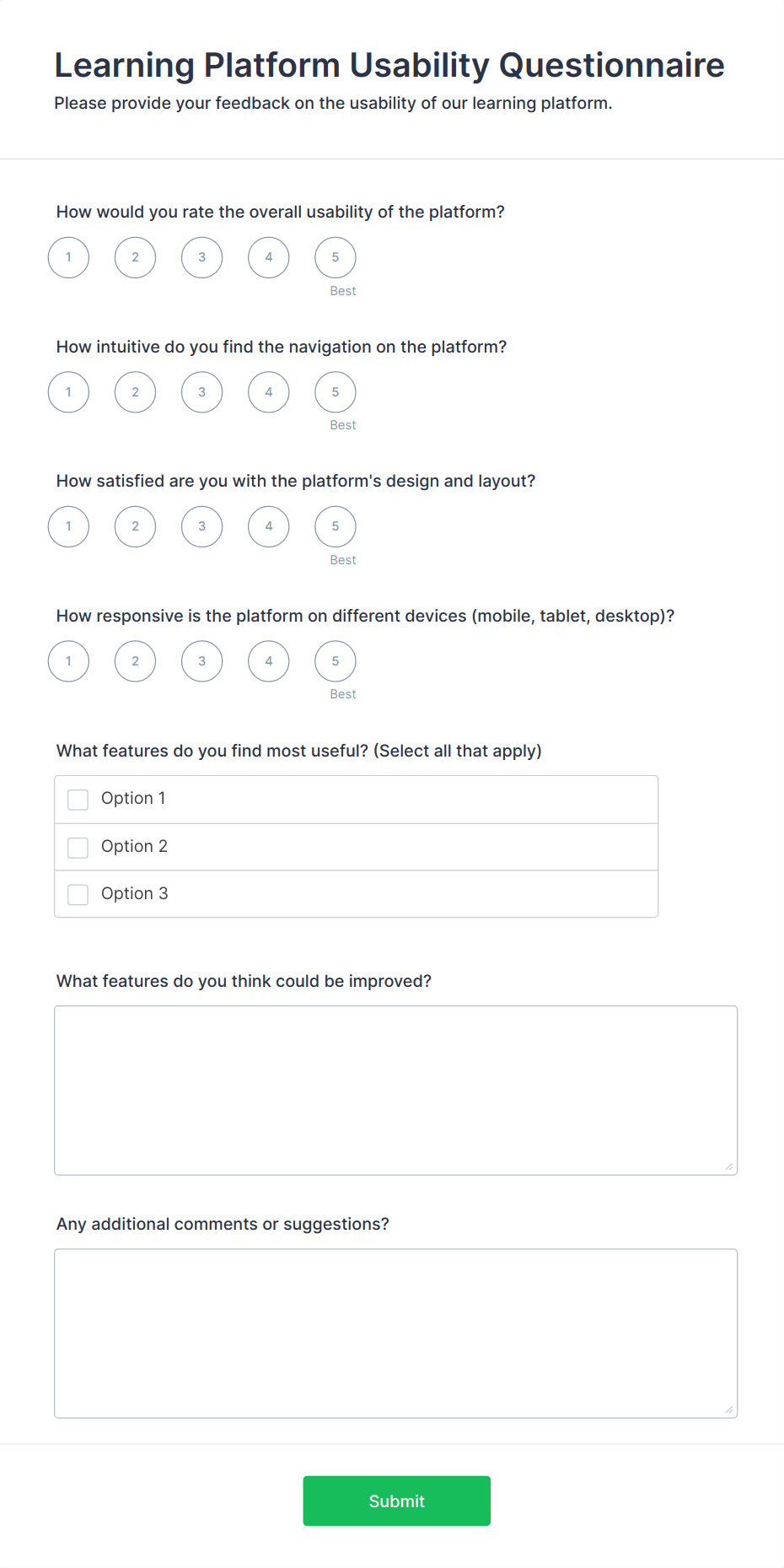 • Content and Fields: A customer satisfaction survey may focus on rating scales and open-ended feedback, while a market research survey might include demographic questions and multiple-choice options. Employee engagement surveys often require anonymity and may use Likert scales, whereas event feedback forms might include questions about logistics and speaker quality.