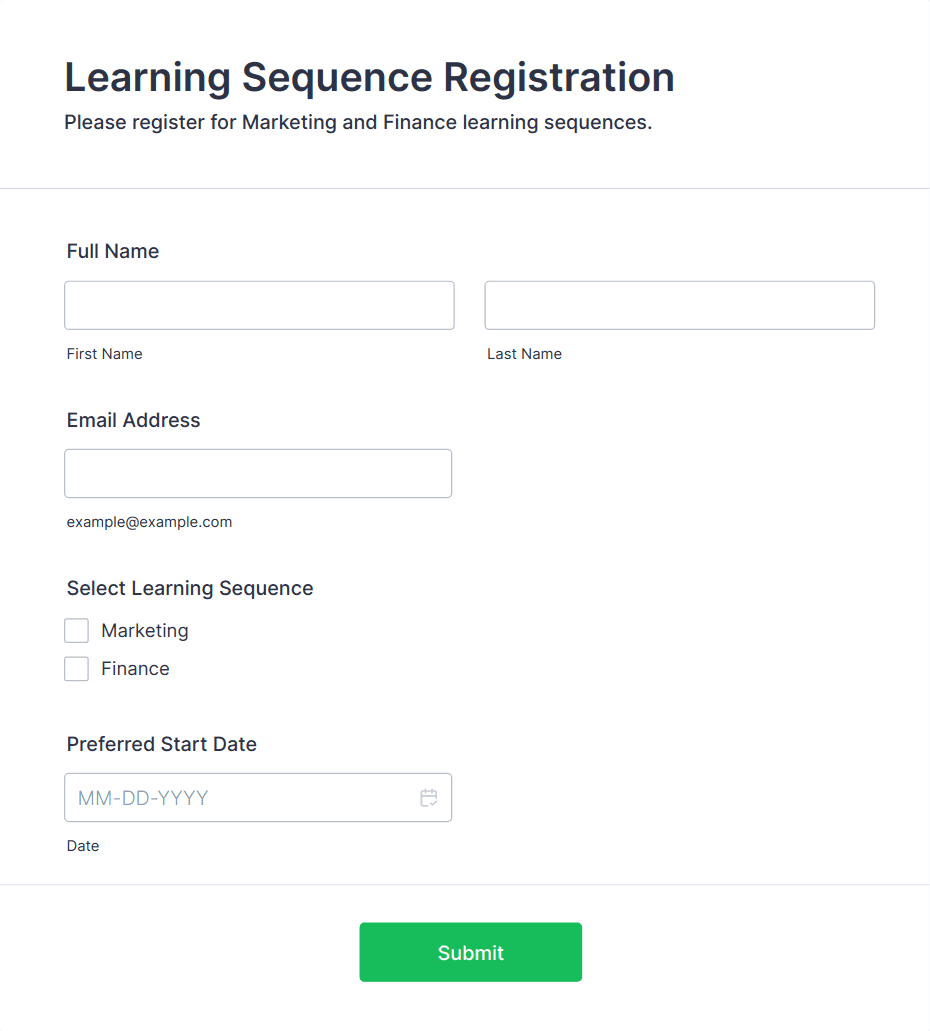 • Corporate Training: Collect employee ID, department, and supervisor approval.