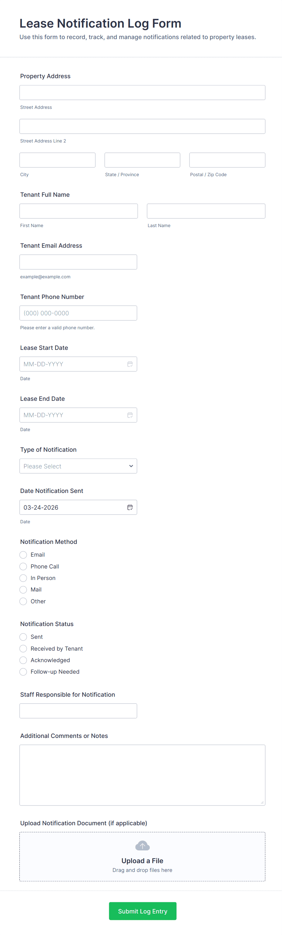 • Maintenance Requests: Tenant name, unit number, issue description, urgency level, file upload for photos.
