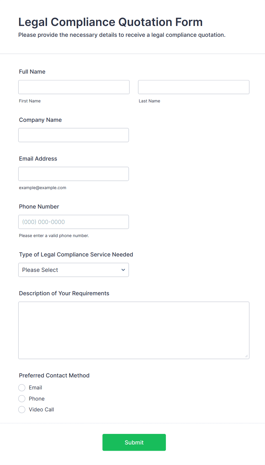 Quote forms are specialized online forms designed to collect information from customers or clients seeking a price estimate for products or services. These forms are commonly used by businesses in industries such as insurance, construction, event planning, logistics, and professional services, where pricing can vary based on specific requirements. By gathering essential details—such as project scope, service preferences, quantities, and contact information—quote forms enable businesses to provide accurate, tailored quotes efficiently. They streamline the initial inquiry process, reduce back-and-forth communication, and help both parties set clear expectations from the outset.