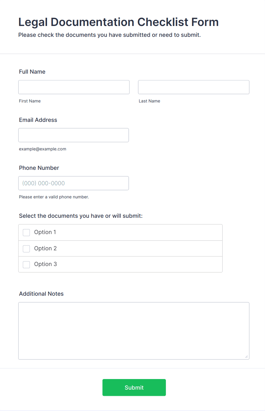The form templates here are for informational purposes only. Jotform is not providing legal, financial, or other advice, or implying that the forms are legally valid in all or any jurisdictions. Before using any such form, consult an attorney and/or other applicable professionals to make sure that the form meets your needs, legally and otherwise.