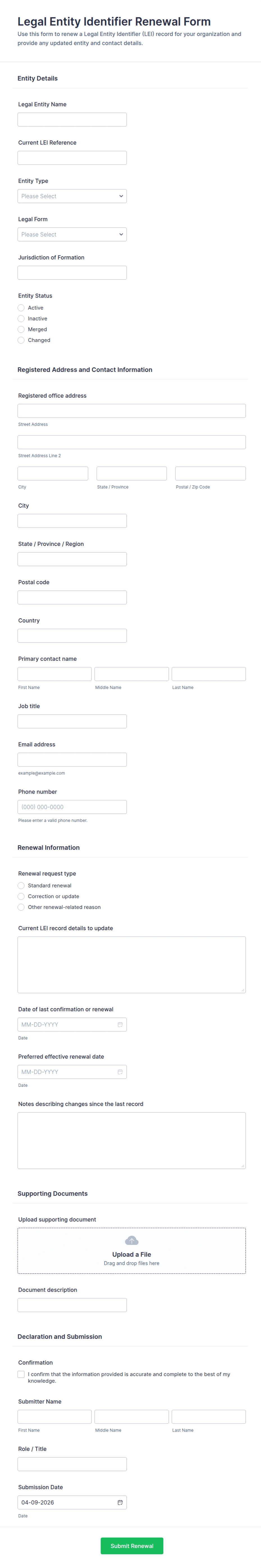 - Renewal-specific fields: Membership/License/Policy Number, Expiration Date, Document Upload (for certifications or proof of eligibility).
