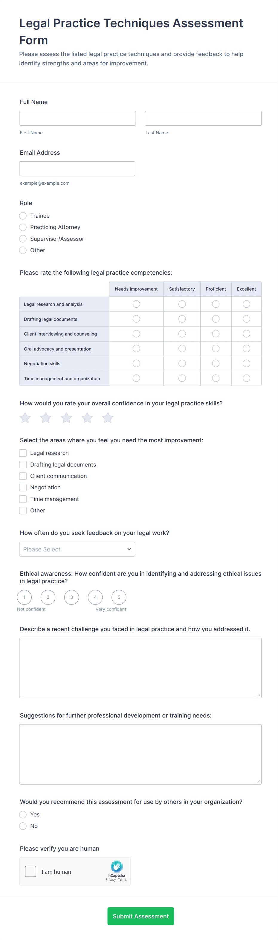 Assessment Form Templates are pre-designed digital forms used to evaluate, measure, or analyze knowledge, skills, performance, or other criteria across a variety of settings. These templates are commonly utilized in education for student assessments, in the workplace for employee evaluations, in healthcare for patient screenings, and in many other fields where structured feedback or data collection is essential. Assessment forms can range from simple quizzes and self-assessments to complex multi-section evaluations, making them versatile tools for gathering actionable insights and supporting decision-making processes.