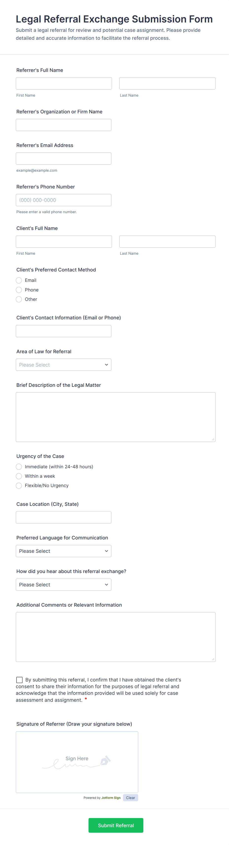 • For healthcare or sensitive referrals, include fields for privacy agreements or HIPAA compliance.