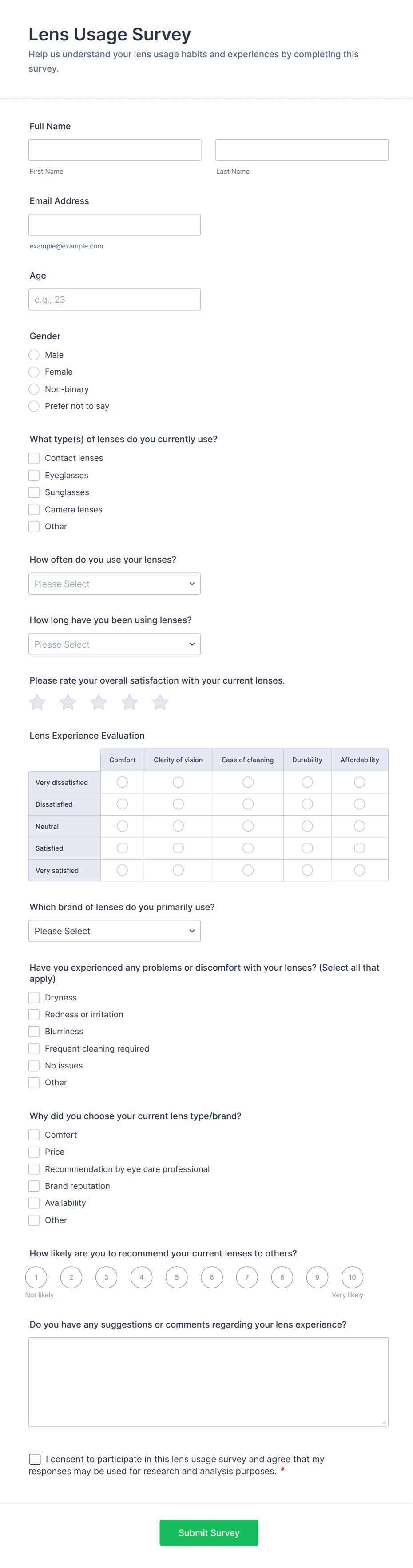 • Short and long text fields for open-ended feedback.