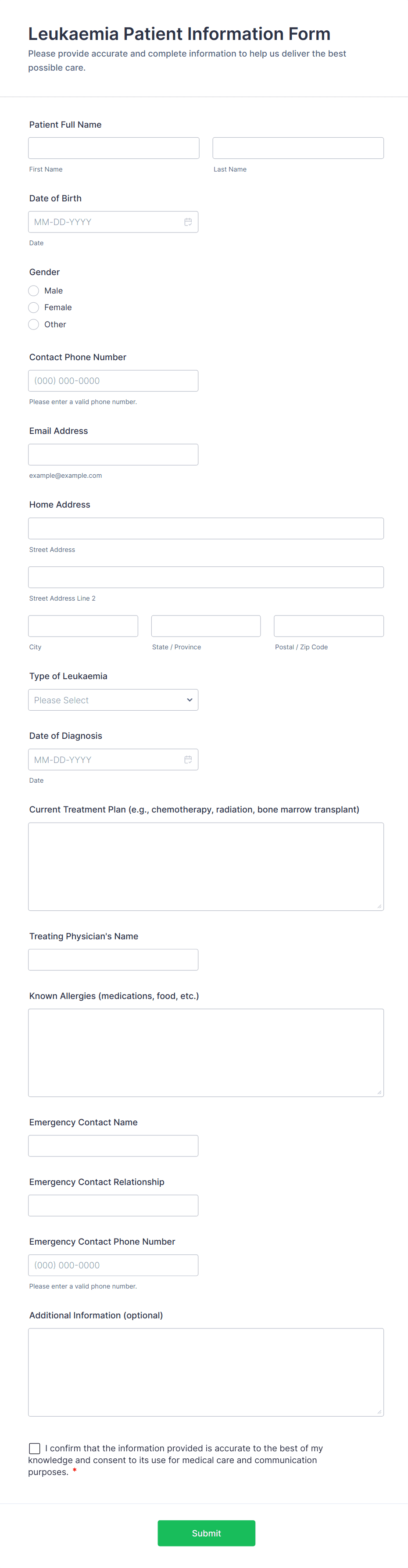 Intake forms are essential tools used to gather preliminary information from clients, patients, customers, or participants before providing a service or beginning a process. These forms streamline the onboarding process by collecting relevant details such as contact information, background data, preferences, and specific needs. Intake forms are widely used across various industries, including healthcare (patient intake), legal (client intake), education (student intake), human resources (employee onboarding), and service-based businesses (client consultations). By standardizing the information-gathering process, intake forms help organizations ensure consistency, improve efficiency, and deliver personalized experiences.