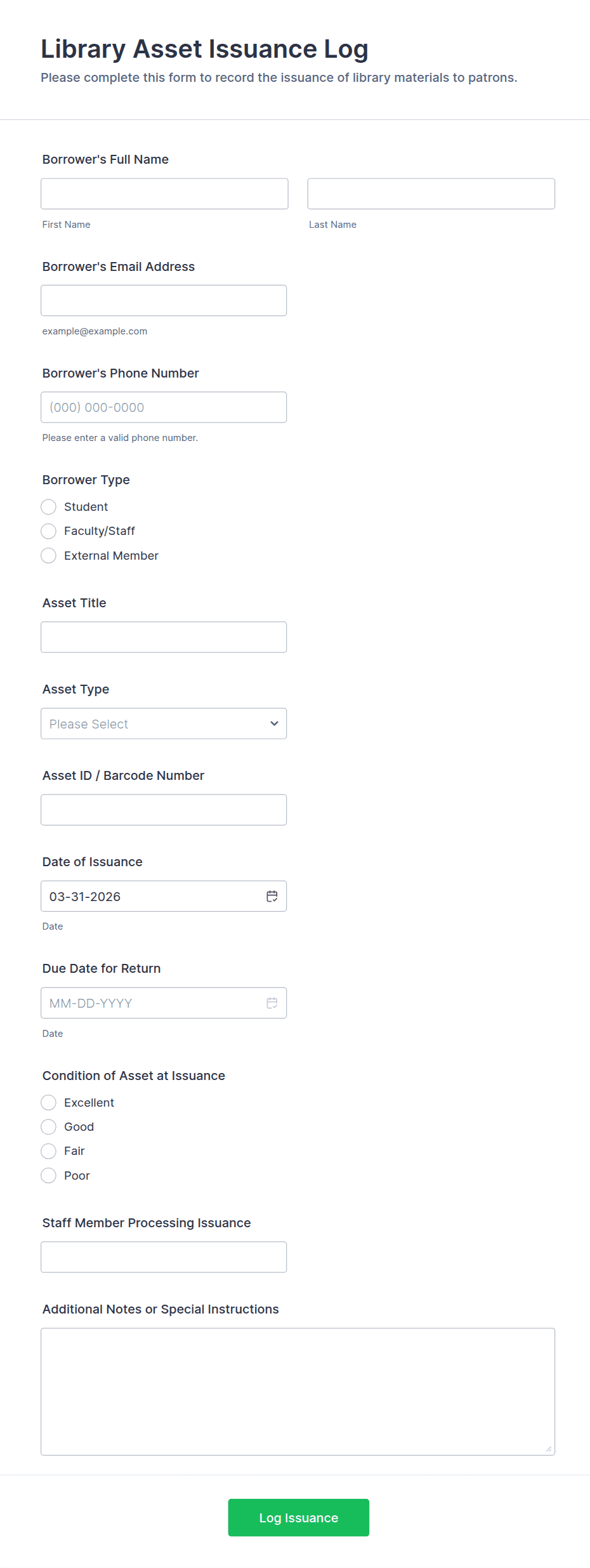 Asset Tracking Forms are specialized digital tools designed to help organizations monitor, record, and manage their physical or digital assets efficiently. These forms are commonly used to log details about equipment, inventory, vehicles, IT hardware, or any valuable property, ensuring that assets are accounted for throughout their lifecycle. Typical use cases include tracking asset check-ins and check-outs, scheduling maintenance, recording asset conditions, and managing asset assignments to employees or departments. By centralizing asset information, these forms help reduce loss, improve accountability, and streamline audits or compliance processes.