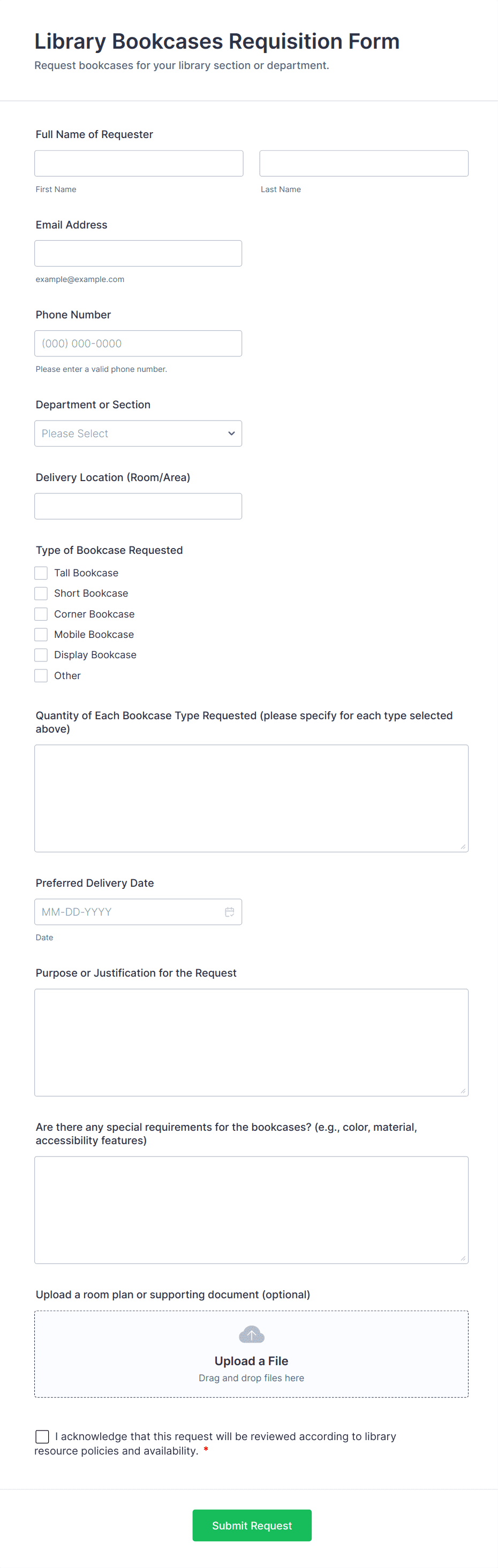 • For internal requests, add employee ID and department fields.
