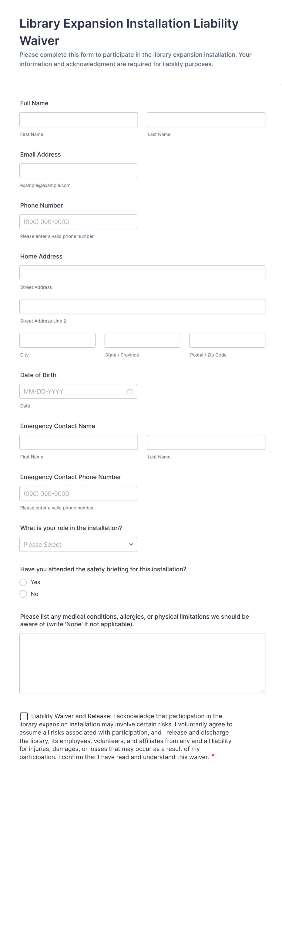 • Content and fields vary by use case: A gym waiver may require health disclosures, while a school field trip waiver may need emergency contact information.