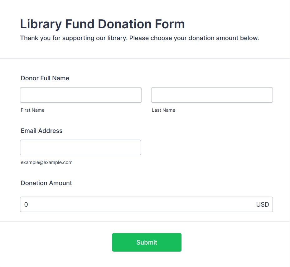 Donation forms are specialized online forms designed to collect contributions for charitable organizations, fundraising campaigns, nonprofit initiatives, and community projects. These forms streamline the process of gathering donor information, processing payments, and tracking contributions, making it easier for organizations to raise funds efficiently. Donation forms can be used for a variety of purposes, such as one-time or recurring donations, event sponsorships, crowdfunding efforts, membership drives, and emergency relief campaigns. They are essential tools for nonprofits, schools, religious groups, and community organizations seeking to engage supporters and facilitate secure, convenient giving.