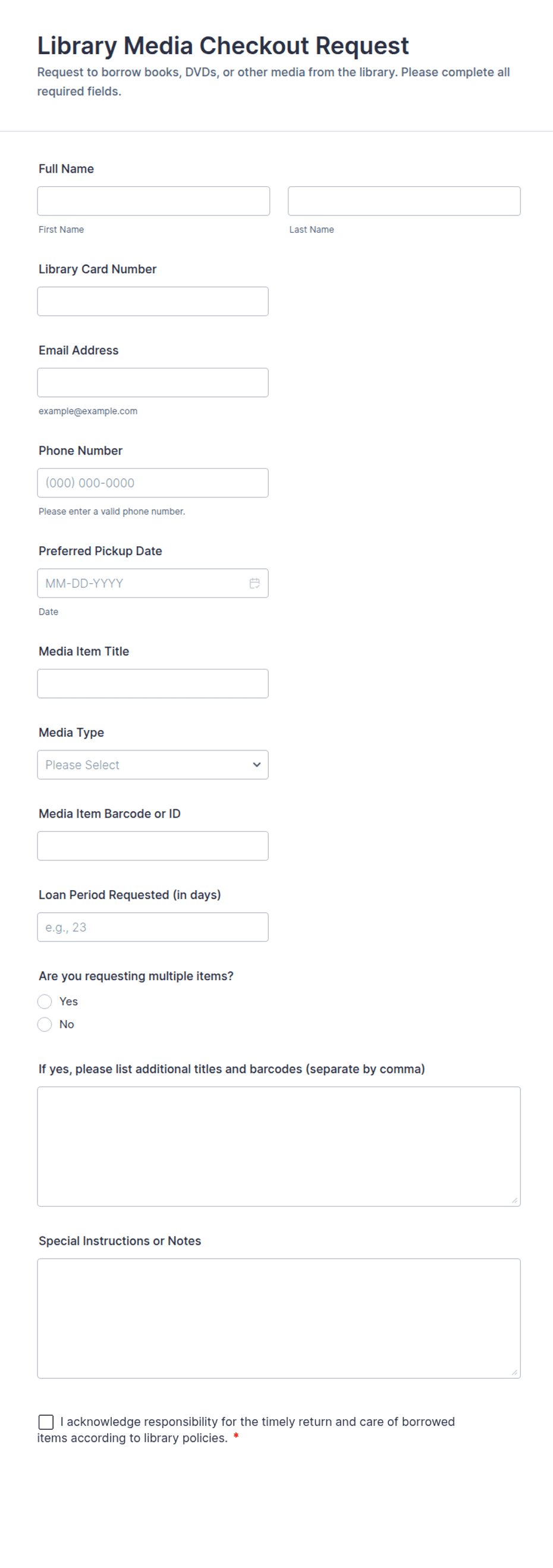 Looking to streamline your library’s card application and book reservation processes? Jotform’s free online Librarian Forms make it easy to record and manage form data from a single location. Get started right away with one of our readymade form templates below — and give it a personal touch in seconds using our no-code form builder. Drag and drop to upload your library’s logo, install helpful widgets and integrations, edit premade text fields and checklist items, and much more. Share your form by embedding it in your library’s website, or generate a custom QR code to place on the front desk. Create a simple and paperless experience for your library patrons with our fully-customizable Librarian Forms that work on any device.