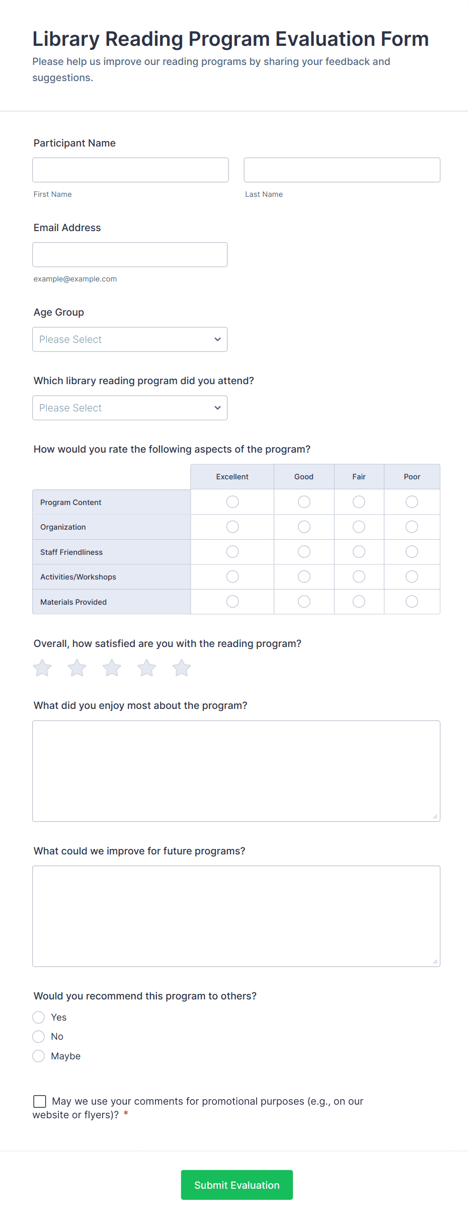 A book recommendation form is used by librarians to collect book recommendations from patrons and to keep track of reading preferences. Customize this template according to your needs. No coding!