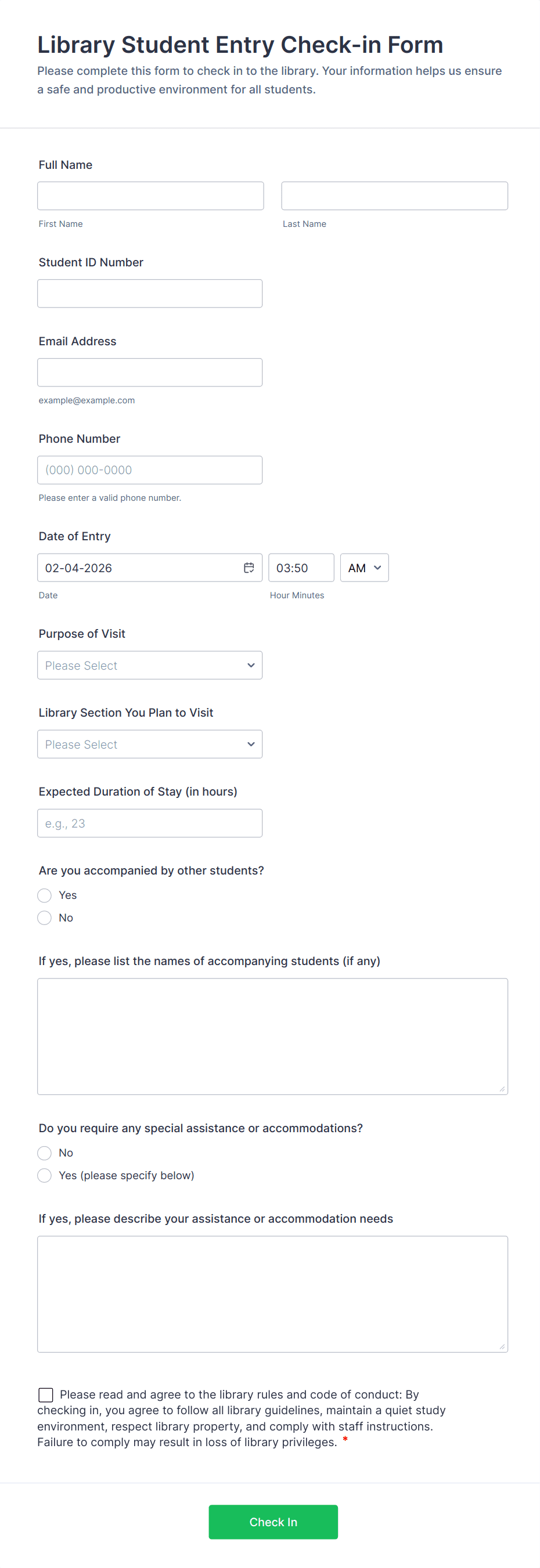 - Basic Fields: Name, email, phone number, date and time of check-in.