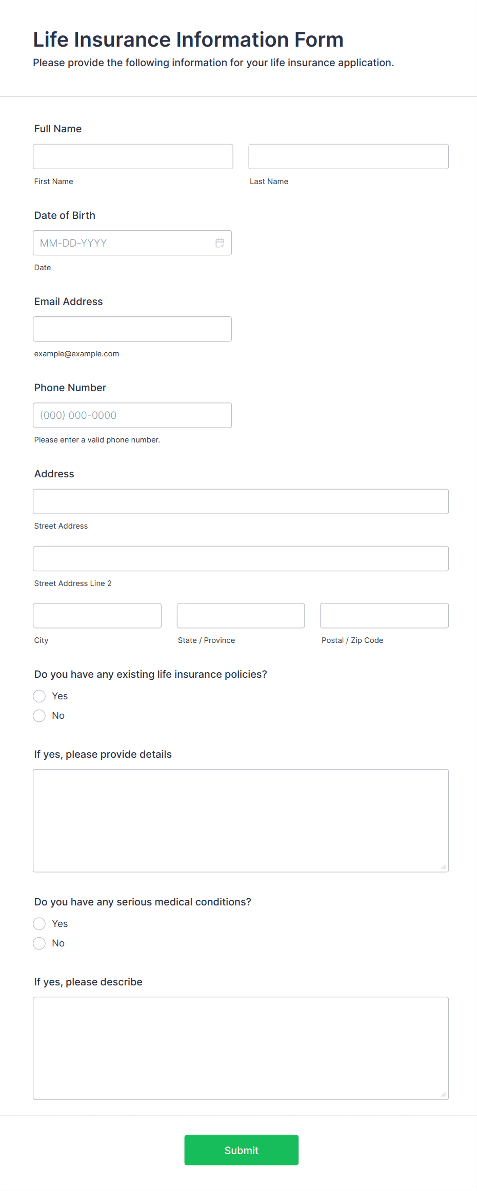 An insurance form is a document used to collect information related to insurance policies, claims, applications, or updates. It helps insurance providers gather necessary data from clients or policyholders efficiently.