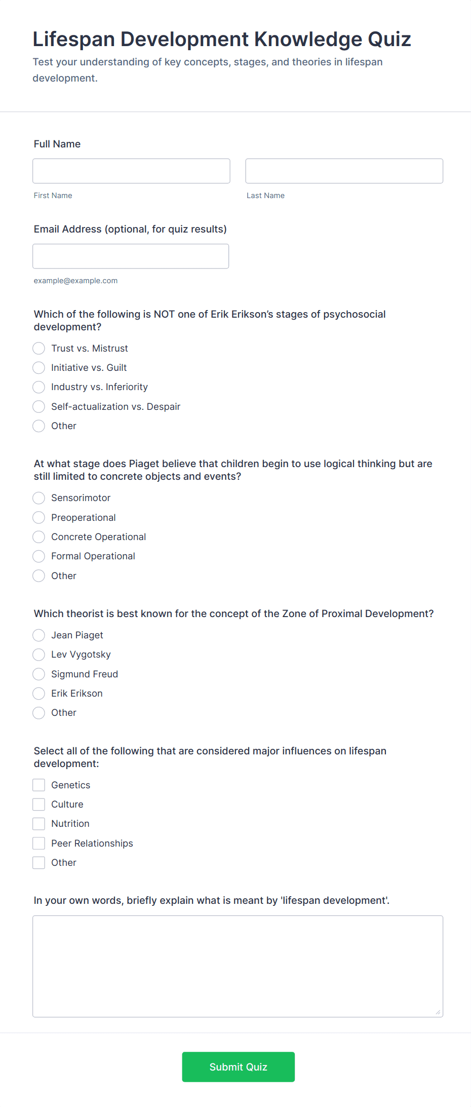 Quiz Templates are pre-designed forms specifically created to facilitate the process of building quizzes for a variety of purposes, such as education, employee training, lead generation, event engagement, and more. These templates provide a structured way to present questions, collect answers, and automatically score or evaluate responses. Whether you’re a teacher assessing student knowledge, a business running a product knowledge test, or a marketer creating a fun personality quiz, Quiz Templates offer a flexible foundation to suit your needs. They can be used for online exams, trivia games, onboarding assessments, customer feedback quizzes, and interactive learning modules.
