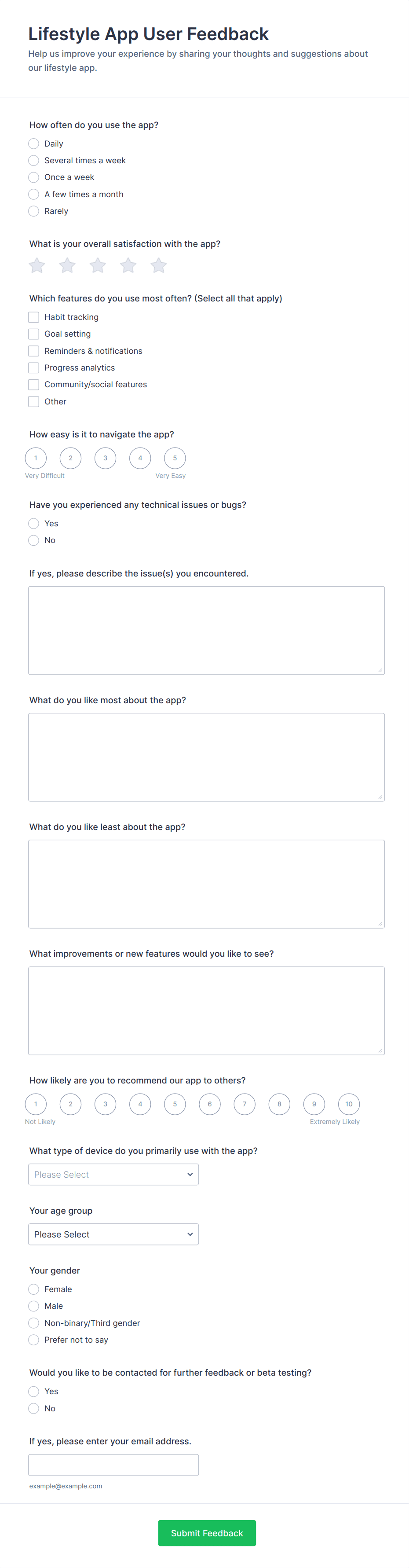 • Beta feedback forms may require fields for bug reporting and suggestions, while ongoing improvement surveys might focus on long-term user experience.