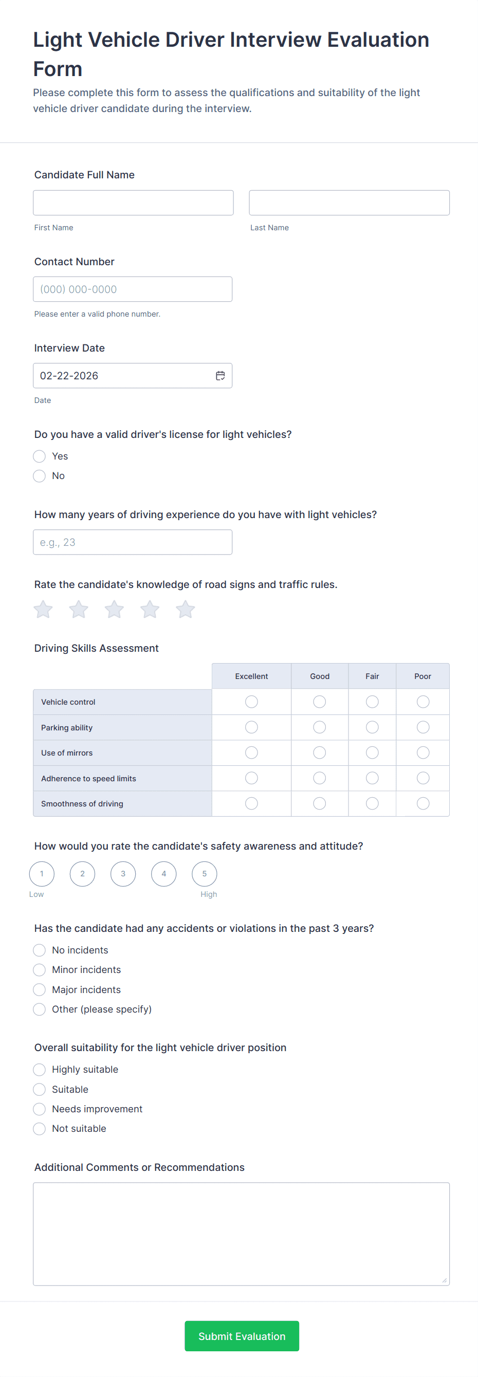 Staying safe on the road is important not just for drivers, but also for every commuter. If you are a highway regulator or a bus operator looking to evaluate a driver's cognitive or physical limitation related to safely operating vehicle, use this bus driver evaluation form to get started. This driver evaluation form has all the list of driving skills in table format where you can select if they're good at it or needs improvement. You can use this drivers evaluation form to give scores to drivers and mark if they pass or fail the evaluation. This driver evaluation form template has a fixed section for the bus route, the body number, and their operator. Use this driver assessment form template now and make the public safe from accidents.