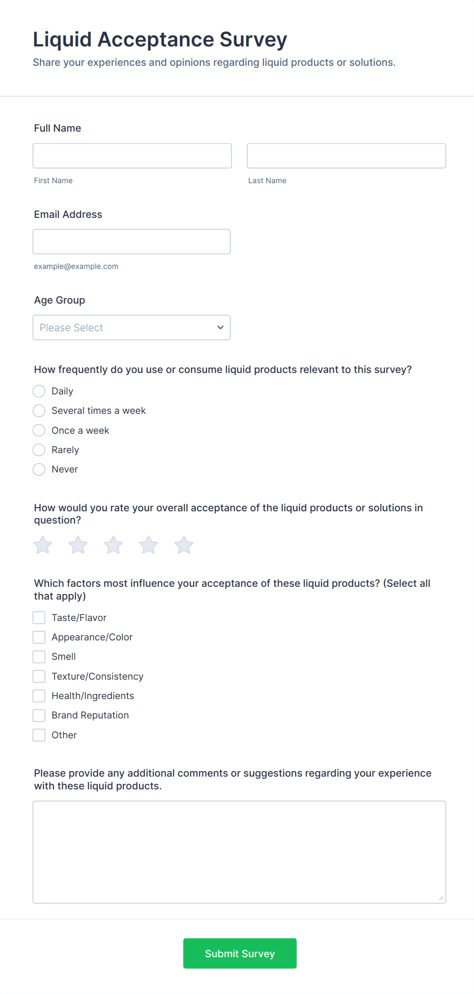 • Short and long text fields for open-ended feedback.