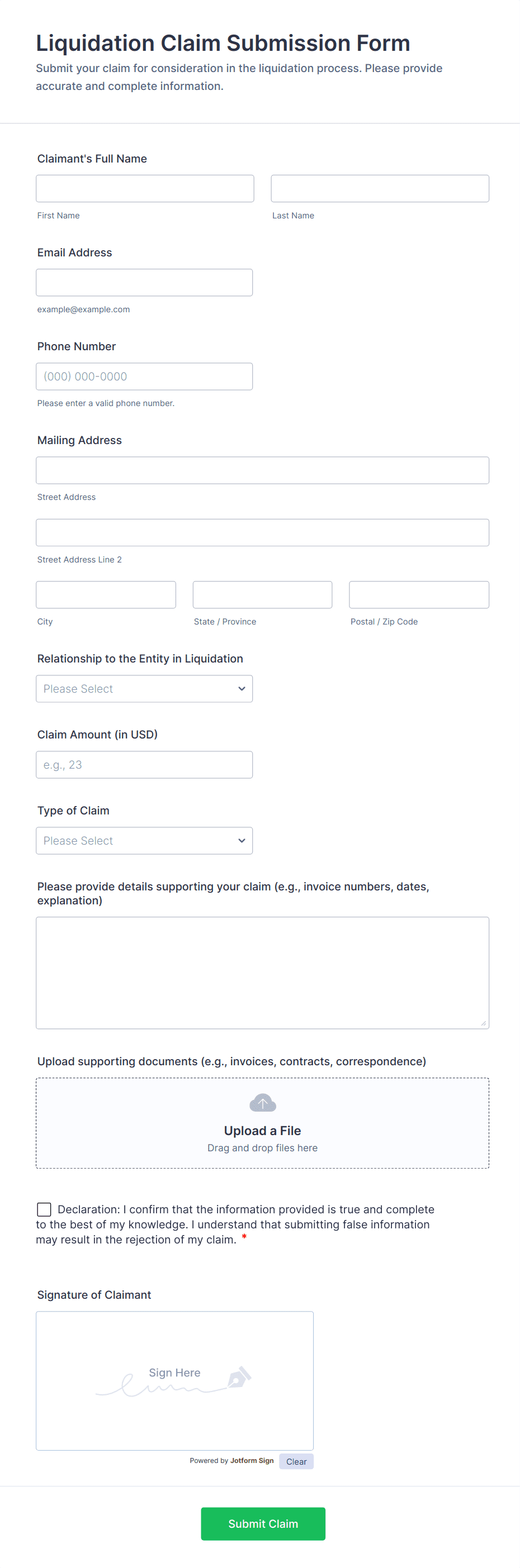 - Use Jotform’s conditional logic to show or hide fields based on user responses (e.g., only display additional fields if a certain claim type is selected).