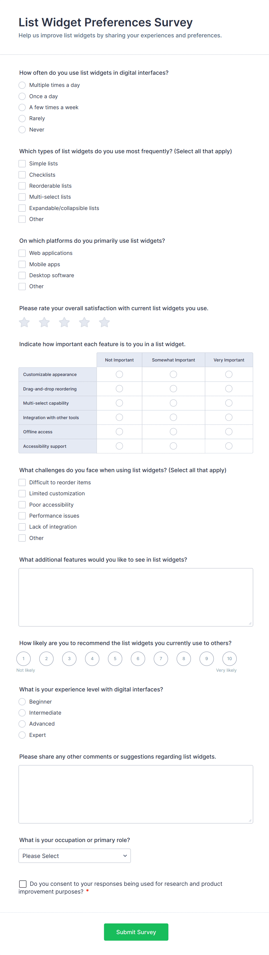 - Multiple choice and rating scales for satisfaction or feature evaluation.