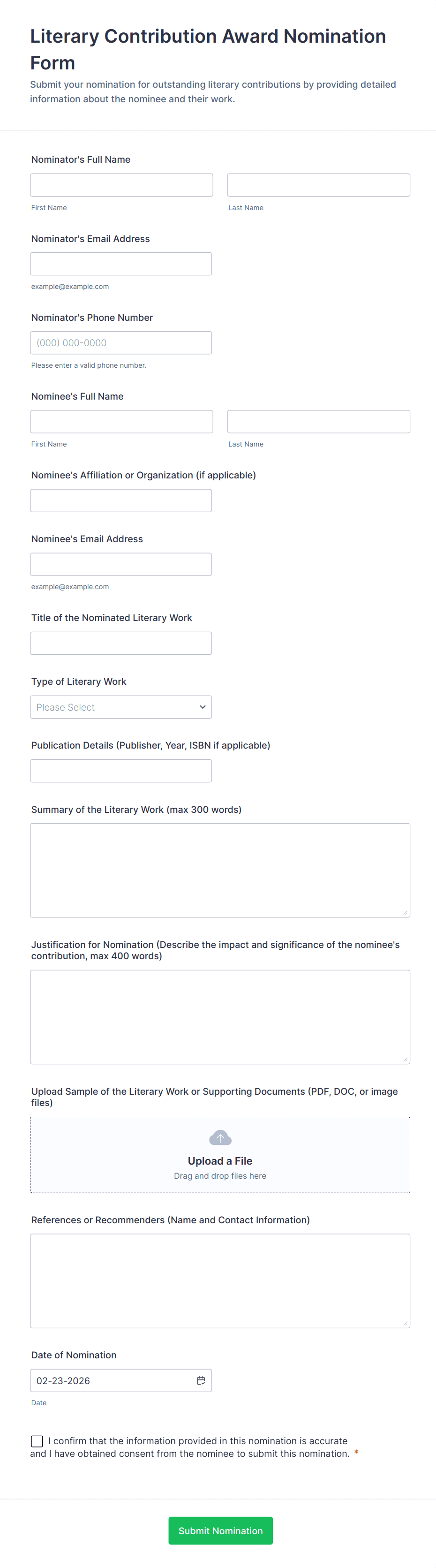 Collect nominee name, role or affiliation, and contact details if needed. Add nominator details and relationship to nominee.