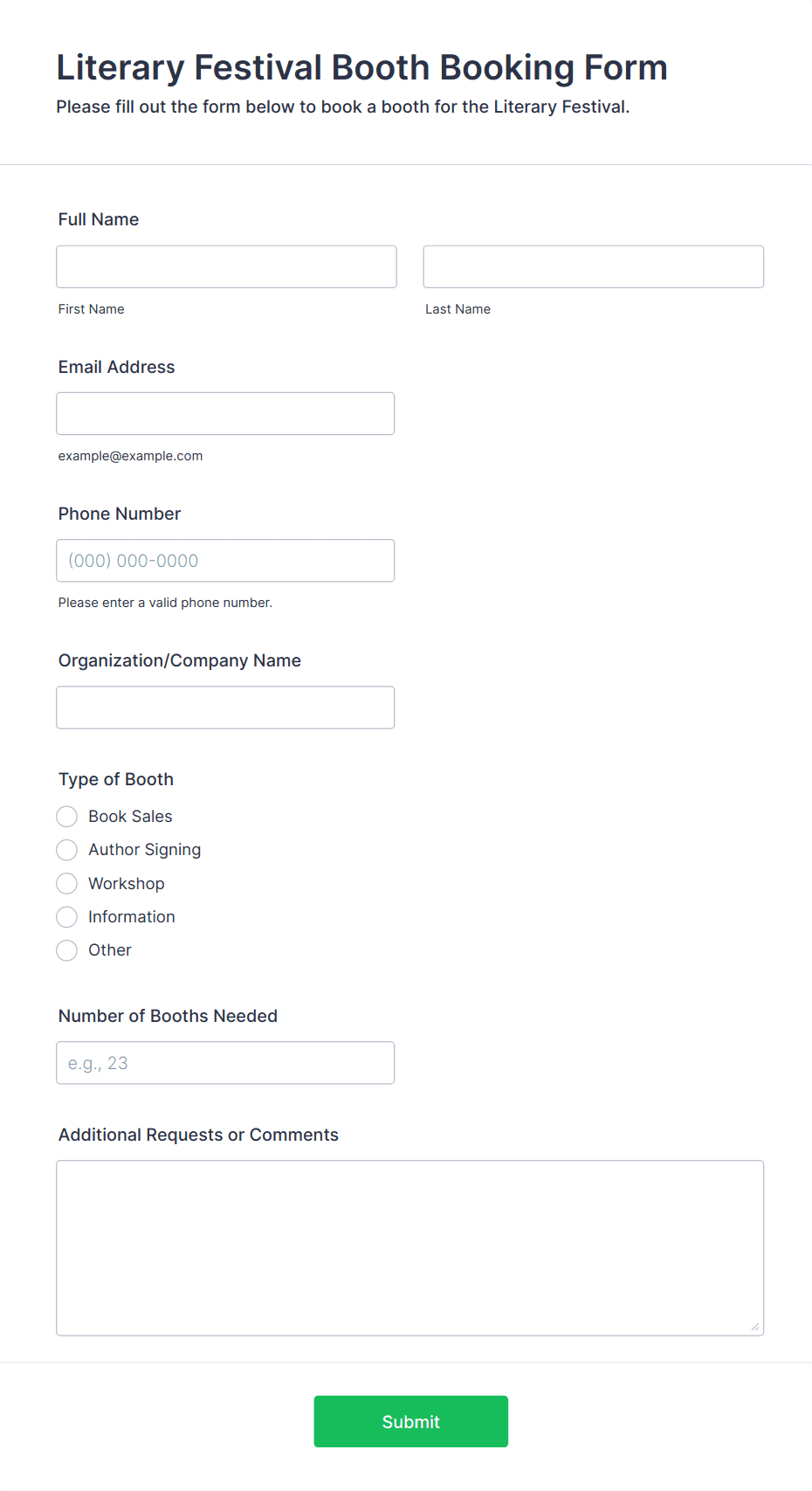 Event Registration Forms are digital tools designed to streamline the process of collecting attendee information for a wide variety of events, such as conferences, workshops, webinars, fundraisers, classes, and social gatherings. These forms allow organizers to gather essential details like participant names, contact information, payment preferences, dietary restrictions, and session selections. By using event registration forms, event planners can efficiently manage RSVPs, track attendance, and ensure a smooth check-in process on the day of the event. The flexibility of these forms makes them suitable for both small private gatherings and large-scale public events, adapting to the unique requirements of each occasion.