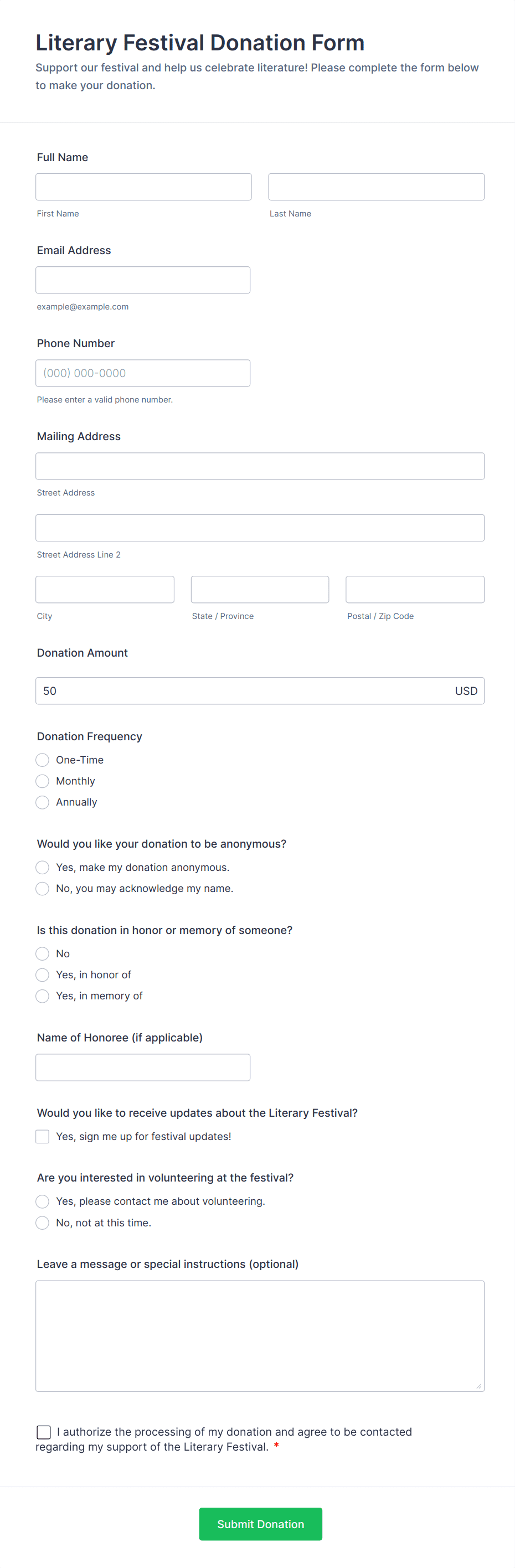 • Memorial or Tribute Donation Forms: Allow donors to dedicate their gift in honor or memory of someone.