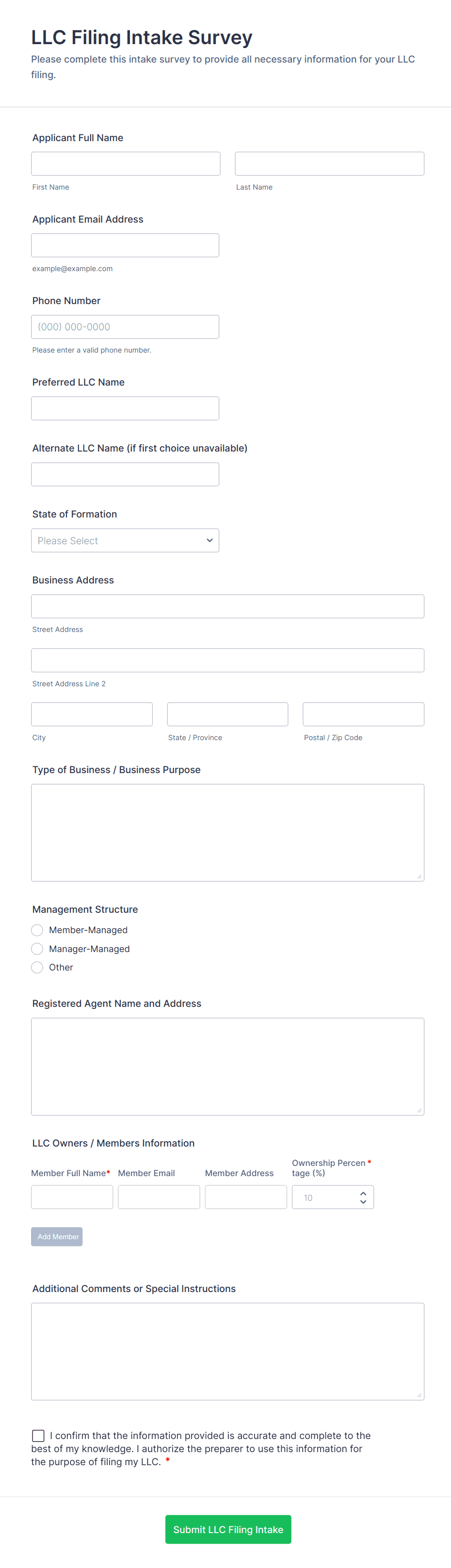 Intake forms are essential tools used to gather preliminary information from clients, patients, customers, or participants before providing a service or beginning a process. These forms streamline the onboarding process by collecting relevant details such as contact information, background data, preferences, and specific needs. Intake forms are widely used across various industries, including healthcare (patient intake), legal (client intake), education (student intake), human resources (employee onboarding), and service-based businesses (client consultations). By standardizing the information-gathering process, intake forms help organizations ensure consistency, improve efficiency, and deliver personalized experiences.