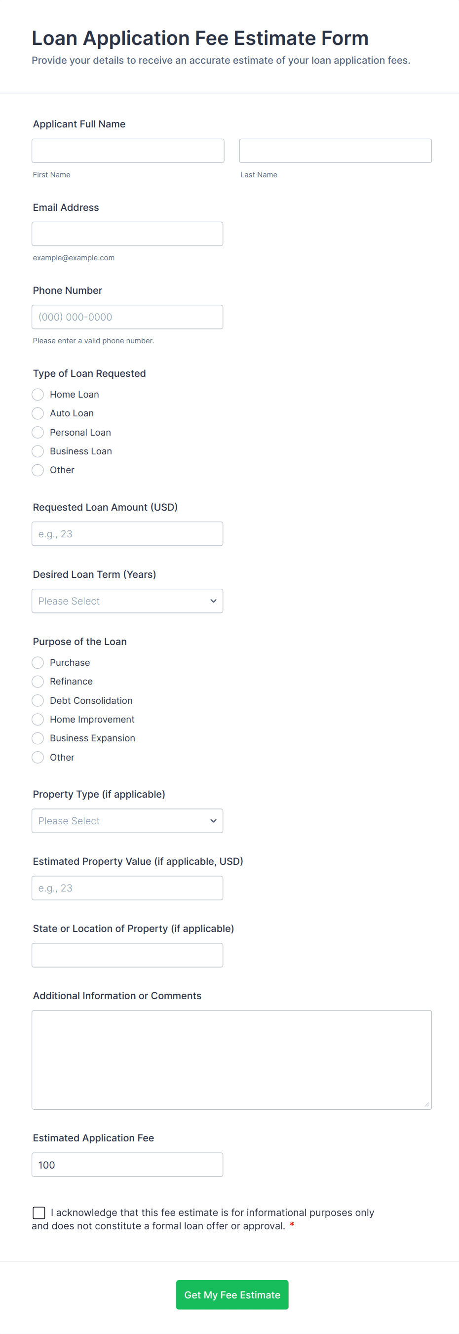 Use conditional logic to show or hide fields based on applicant responses (e.g., only display collateral fields if a secured loan is selected). Integrate with payment gateways if you require application fees. Connect with CRM or workflow tools to automate application tracking.