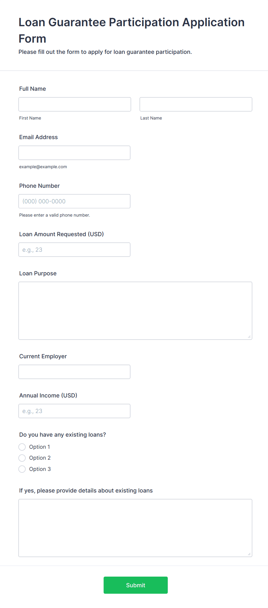 For business loans, include fields for business name, type, financial statements, and tax ID. For mortgage or auto loans, add property or vehicle details.