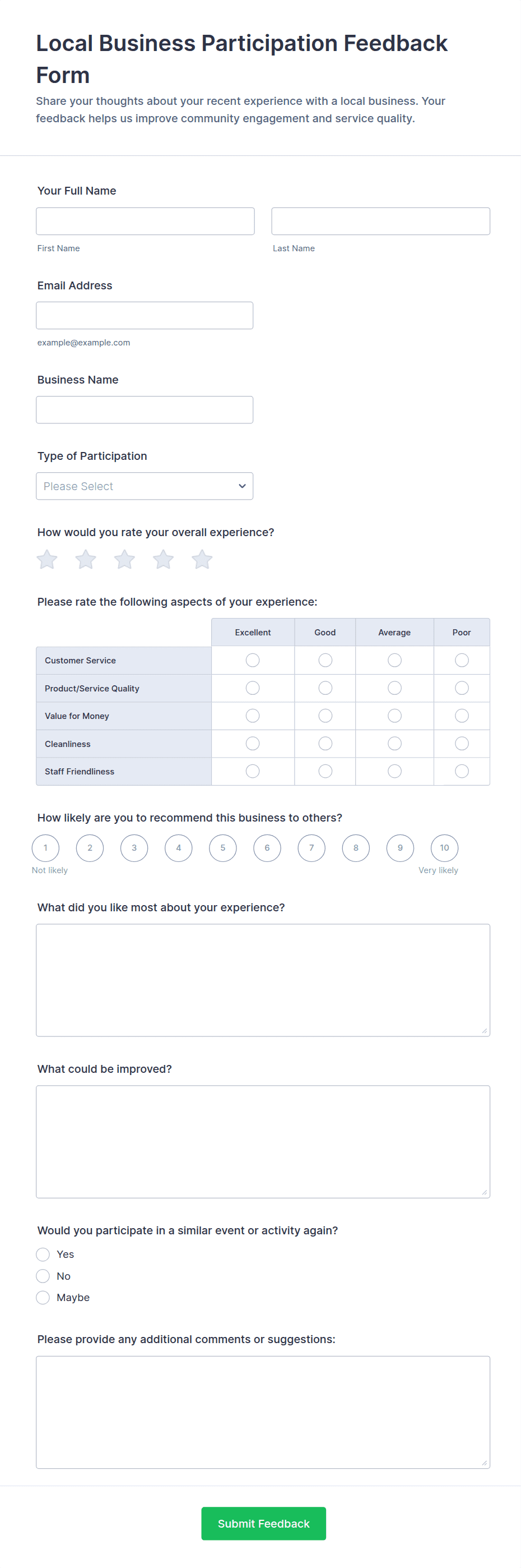 • Open-ended comment boxes for suggestions and detailed feedback